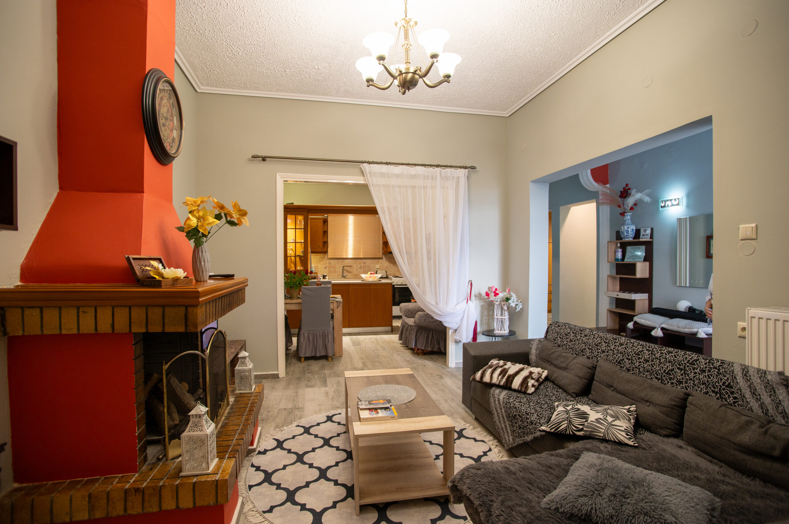 Welcome to our charming apartment, a perfect blend of modern style and cozy comfort, designed to feel like your home from the moment you step inside. Relax in the inviting living area, which features: A beautiful brick fireplace, comfortable seating for lounging and a large TV for your entertainment needs.Natural light and stylish decor, ensuring a bright and relaxing space for your entire stay.
